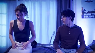 Hot brunette with pierced nipples and stepsister act as lesbians