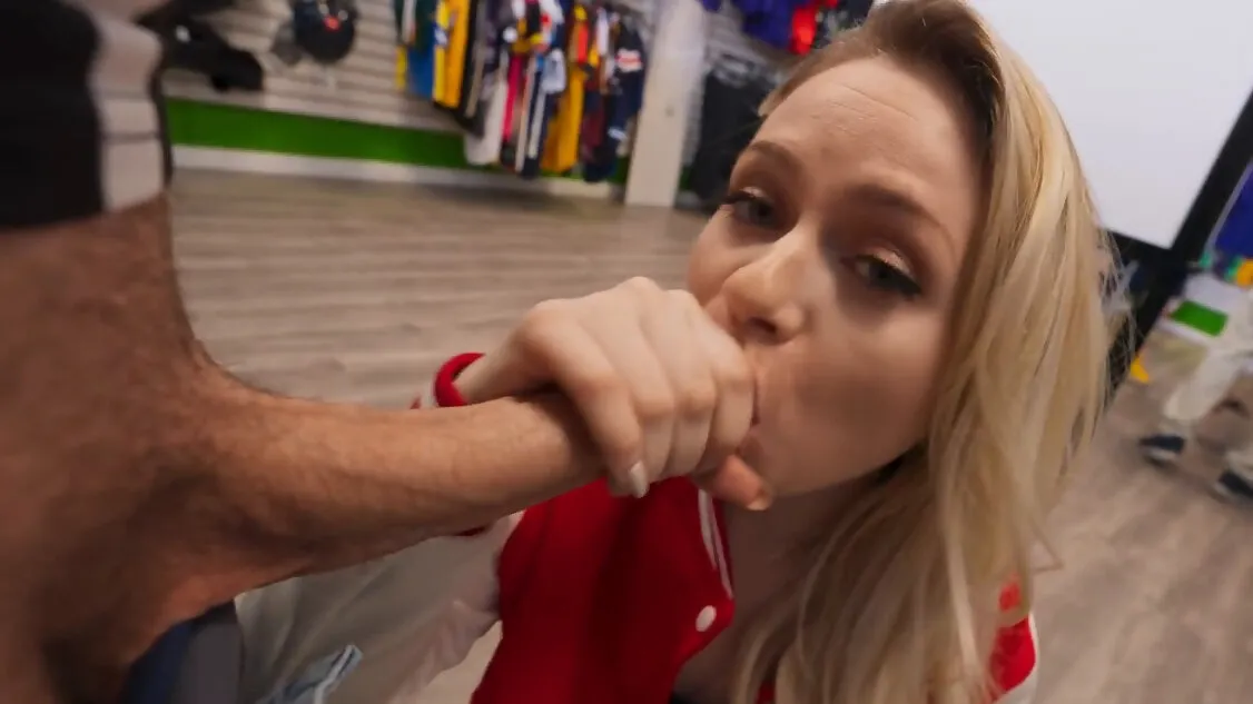 Tony Rubino went to the local clothes store with the hot blonde girl Rylee Blake. She is such a nympho that she couldn't control herself, she showed her tits and ass in public before having sex on the floor.